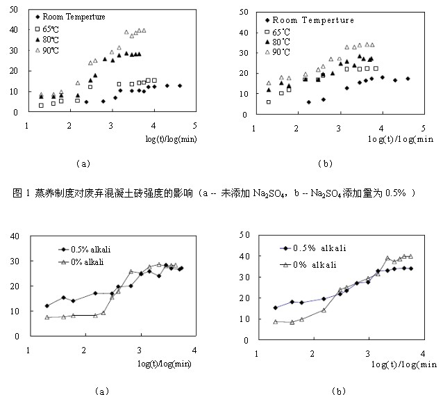 目前對混凝土廢棄物的利用研究大多數(shù)集中在回收粗細骨料方面及制備膠凝材料。但是和天然骨料相比,回收骨料存在低表觀密度和高的吸水率等不足,還不能完全替代天然骨料。制備的混凝土材料強度較低,特別是斷裂強度存在不足,只能應用在低等級混凝土制備。因此盡管開展了對這些廢棄混凝土再利用的研究,但處理很不完善,大部分還是采取露天存放或就地掩埋的簡單方式處理,這樣無疑會占用大量耕地,同時也會造成環(huán)境污染。因此需要找到一條降低廢棄物處理成本、又能充分利用這些廢棄物有效途徑。最近我們利用廢棄混凝土成功制備了可作為墻體承重材料應用的半干壓成型磚,廢棄混凝土的利用率為99%。本文利用廢棄混凝土制備半干壓成型磚,研究了蒸養(yǎng)制度對成型磚性能的影響規(guī)律。